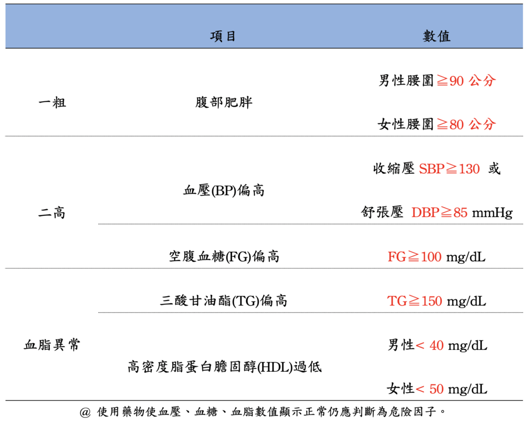 @根據國民健康署公布標準,以下五項符合三項(含)以上者即可判定為代謝症候群: