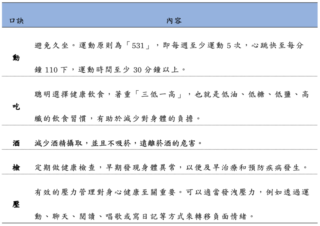 代謝症候群有五大招可以預防,陳醫師的口訣是:「動滋就減壓」