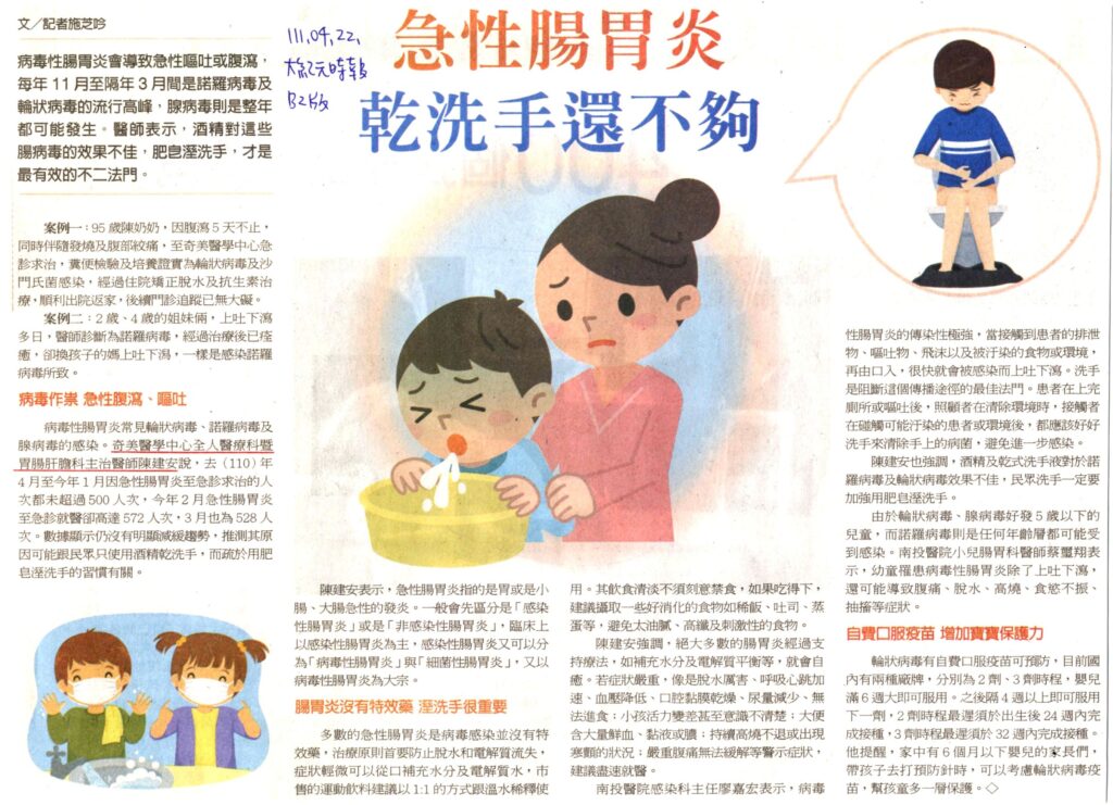 急性腸胃炎單月超過500人次 奇美醫:加強濕洗手並注意警示症狀(ASPN 新聞網)