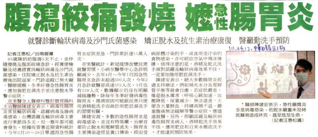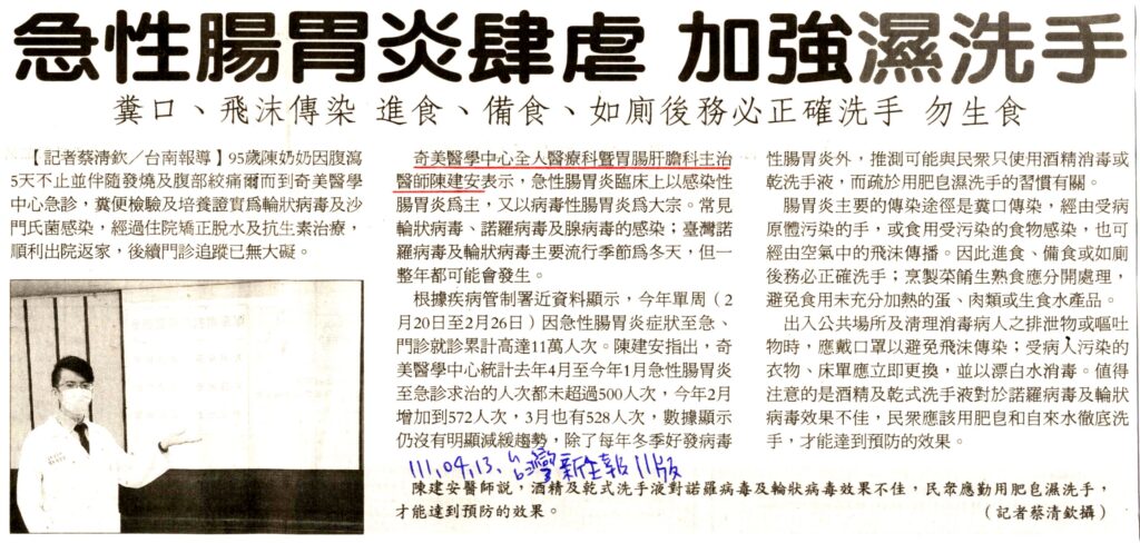 急性腸胃炎肆虐!奇美醫學中心統計單月高達 500 人次以上! 奇美醫學中心提醒:冬季好發,應加強「濕洗手」 並注意警示症狀!(台灣醫療保健新聞網)